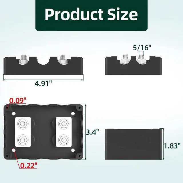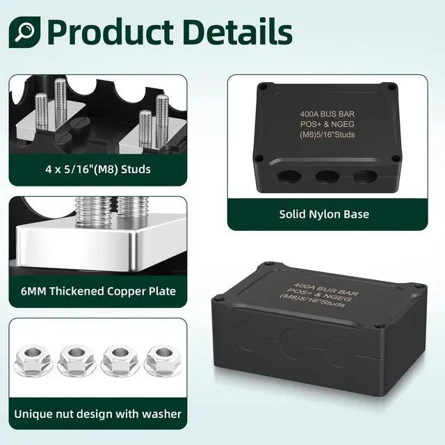 Stud Terminal: The 400A battery copper bus bar terminal block features 4 x 5/16" studs terminal, which makes the 12V junction block able to accept larger size terminal connectors and wires. The nylon bottom is also secured by M8 post which makes it more fixed and won't strip ^^
