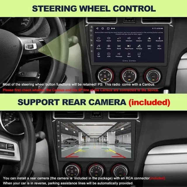 Control Compatibility: You can answer calls, switch tracks, or adjust the volume using your car's original steering wheel buttons. If your vehicle requires a CANBUS connection, please note that the power cable harness in the package must be properly connected to both the CANBUS and the 8-pin port on the back of the radio. Otherwise, the steering wheel control function may not work correctly.