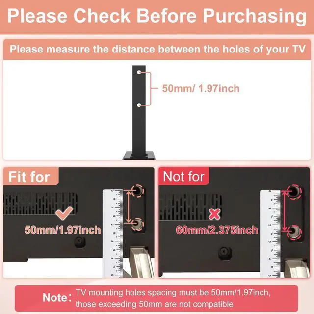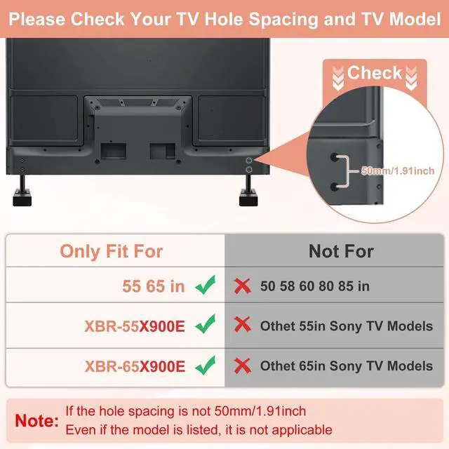 ---Compatibility Check--Before purchasing, please measure the TV hole spacing to ensure it meets the stand's hole spacing 50 mm/ 1.97 inch for a perfect fit and verify that your TV model is listed ^^ ---Compatibility---This TV legs for Sony Bravia TV Only for Sony 55" 65" XBR-55X900E XBR-65X900E. Please double check the model we listed, not universal legs, not for other Sony TV models. ^^ ---Enhanced Stability---Our upgraded TV legs replacement for Sony features a larger base, ensuring greater stability for your TV and preventing wobbling after installation ^^ ---Anti-Slip Protection---The bottom of the TV stand legs for Sony is equipped with a wide range foot pad design, providing superior anti-slip protection and preventing scratches on your desktop ^^ ---High Quality Metal Material---Made from high-quality metal, our tv stands for Sony boasts a stronger load-bearing capacity and is built to last, offering durability and resilience ^^ ---Modernize TV Look -- Upgrade your TV's appearance with our modern Sony Bravia TV legs.