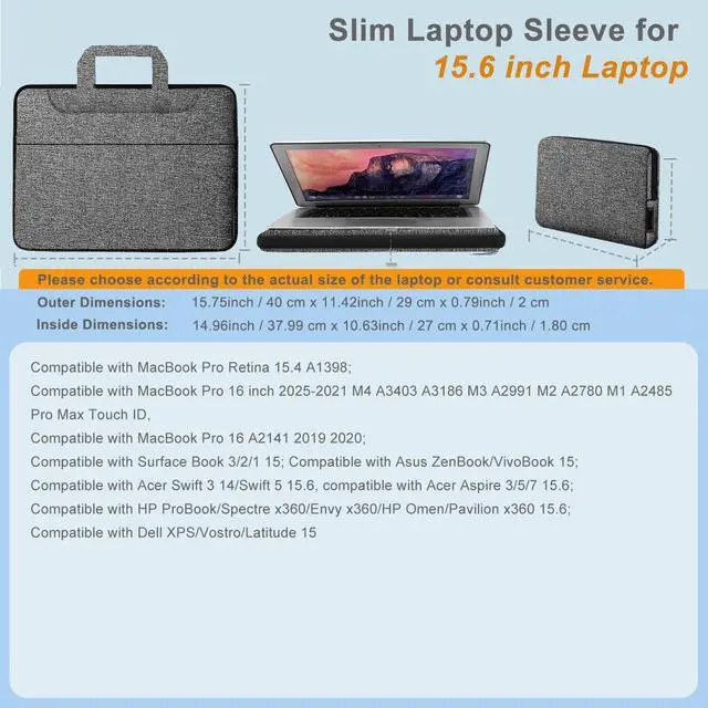 Carry: Designed for effortless portability, this case features a removable and adjustable shoulder strap. The handles can be neatly tucked away when not in use. Plus, the built-in trolley sleeve allows it to slide securely over your suitcase handle, making business travel seamless ^^ Compatible with MacBook Neo 16", MacBook Air Pro 15; compatible with MacBook Pro 16 M5 M4 A3403 A3186 M3 A2991 M2 A2780 M1 A2485 A2141; Compatible with Surface Book 3/2/1 15; Compatible with Asus ZenBook/VivoBook/ExpertBook/TUF Gaming 15.6 16; compatible with Acer Swift Aspire 3/5/7 15.6; Compatible with HP Pavilion/ Victus/ProBook/Spectre/Envy/Omen 15.6"; Compatible with Dell XPS 16/Vostro/Latitude 15.6 16 and most 15.6 -16 Notebooks