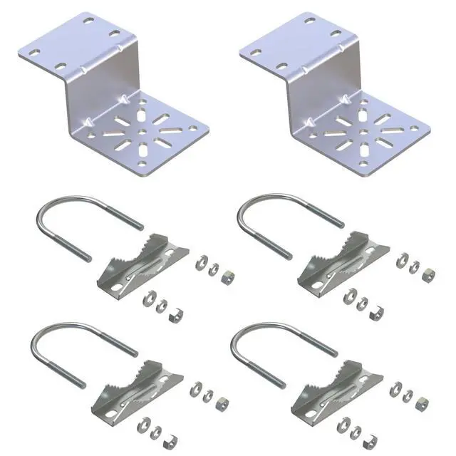 Packing list: 1. Main mounting bracket 2pcs (3 mm thick high quality aluminum) 2. Clamp V Jaw Bracket 4pcsStainless Steel3. U-Bolt 4pcs Stainless Steel4. Nuts 8pcs Stainless Steel5. Spring washers 8pcs Stainless Steel6. Plain washers 8pcs Stainless Steel