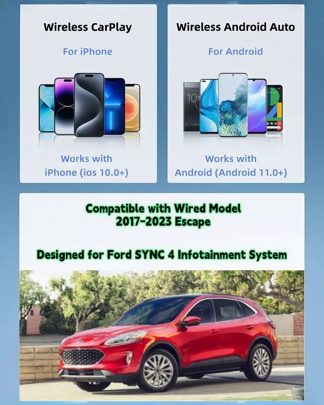 This wireless adapter is specifically engineered for the Escape models launched between 2017-2023 the ones equipped with wired CarPlay and wired Android Auto. Specifically designed Display Audio with Ford SYNC 4 Infotainment System, it delivers a far more seamless connection and faster response speeds. ^^ Ultra-Compact Design ( 0.8 in ^^ 0.32 oz)Meet the Lugzix Mini Cube Adapter (2026 Model) thumb-sized, 50% smaller than its predecessor. Sleek grooved texture delivers a premium touch and extra grip for easy plug-and-pull. Small body, big performance. ^^ Vehicle-specific adapter with 5GHz WiFi 6 &