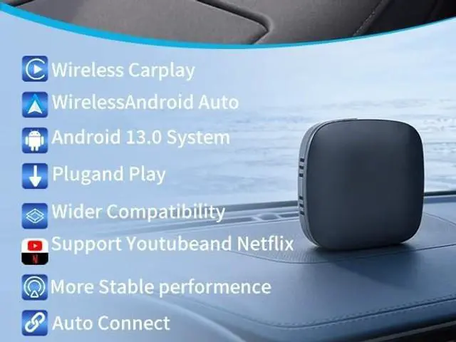 ^^ Powerful AI Chipset for Smooth Performance. Equipped with a next-generation APowerful AI Chipset for Smooth Performance. Powerful AI Chipset for Smooth Performance. Equipped with a next-generation AI chip and an eight-core processor, this CarPlay adapter ensures high-speed data transmission and smooth operation. With 2GB RAM+16GB ROM, TF card support up to 128GB, storage space won't be a concern., giving you plenty of space for apps, videos, and music. ^^ Universal Compatibility for iPhone and Android Devices. This wireless CarPlay adapter is compatible with iPhone 6 and above, as well as Android phones running Android 10.0 and above.