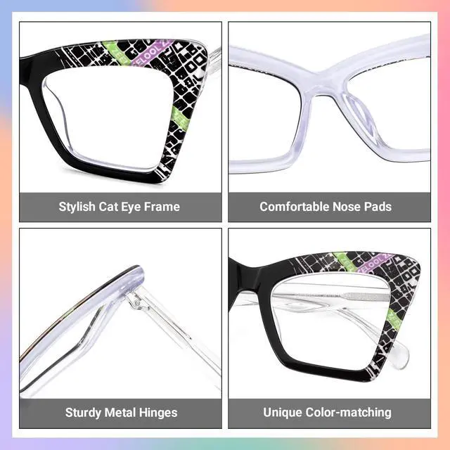 Trendy Cat eye frame glasses that transform your look and complement your personal fashion flair. ^^ The unique color combination of these eyeglasses makes you the center of attention in the crowd. ^^ Stylish thick frame glasses provide more inspiration for your everyday clothing matching. ^^ Blue light blocking glasses can effectively block blue light and UV400, which is very suitable for people who often work in front of the screen or play games.