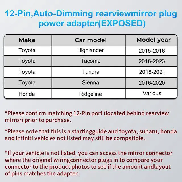 Examples include: Toyota Tacoma (20162023, various trims), Toyota Tundra (20182021, various trims), Subaru models (20122016). Please check the compatibility chart below and confirm your vehicles mirror connector before ordering. If unsure, contact Mangoal Support for assistance.