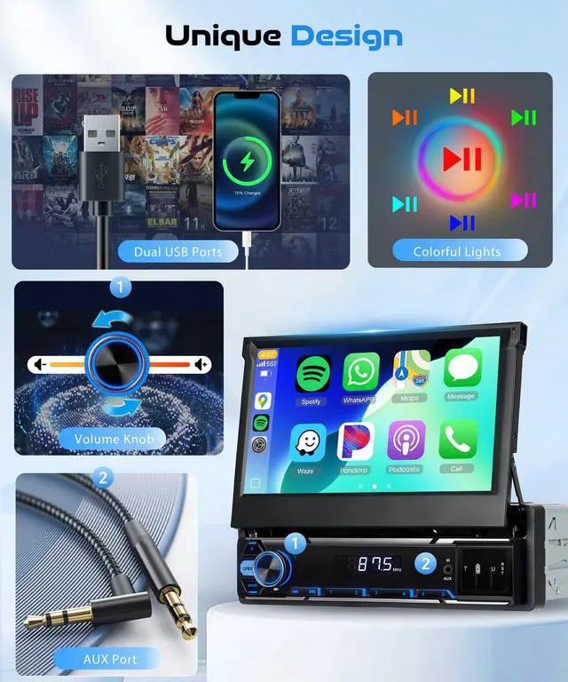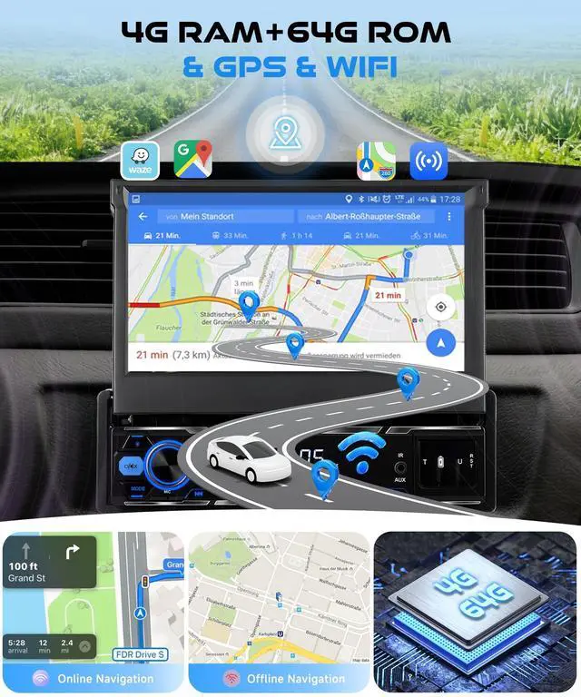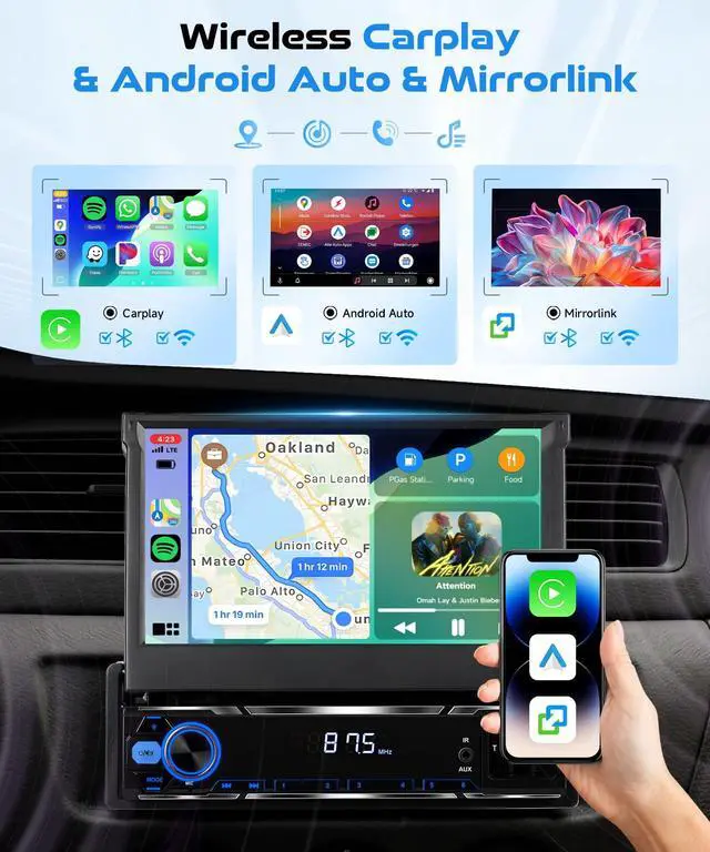 7-inch Manual Flip-Out Touch Screen Single din flip out Android car radio with 1024600 capacitive screen folds flush when parked, tilts for glare-free view; single din Android head unit keeps dash clean and theft-deterrent. ^^ Android 15 Powerhouse 4 GB RAM + 64 GB ROM, RK3326S quad-core chip, boots in 12 s; run Google Maps, Spotify, YouTube offline/online without lag on this single din Android car stereo. ^^ Wireless CarPlay & Android Auto no dongle needed; voice-command Siri/Google for hands-free calls, texts, GPS, music; mirror-link streams Netflix & TikTok on the single din flip out screen Android radio.