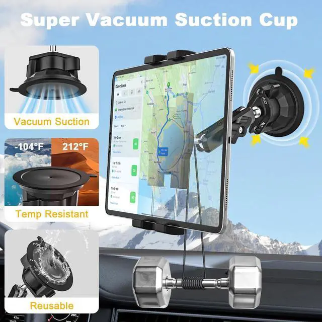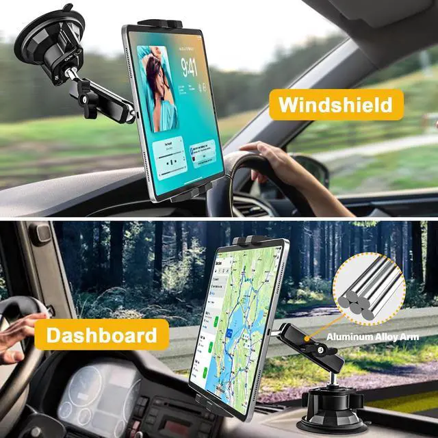 Powerful Vacuum Suction CupThis strong suction tablet holder for car features a large suction cup ( 3.3 inch ) for a very secure attachment to the dashboard, windshield, or windows. It stays firmly in place even on bumpy roads, making it a reliable car accessory. It also comes with an additional adhesive pad for use on uneven dashboards. ^^ Stable & DurableThe newly upgraded heavy-duty car tablet mount uses a large amount of robust and durable metal materials, featuring metal arms and aluminum alloy ball joints to ensure equipment safety and bracket durability.