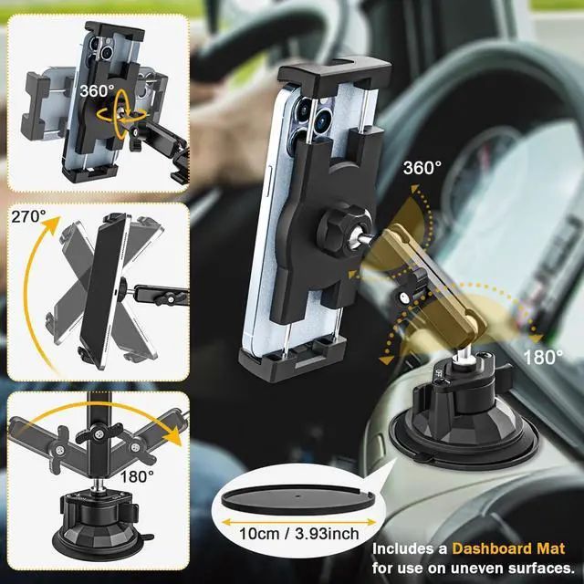 It is ideal for use on cars, trucks, vans, tractors, and other vehicles. ^^ Flexible Viewing AnglesThis windshield dashboard tablet mount features an adjustable arm and dual ball joints, allowing for 360 rotation to ensure you find the optimal viewing angle for your device. Whether you're navigating, watching media, or making hands-free calls, this car iPad holder offers unparalleled flexibility. ^^ Universal Broad CompatibilityCar tablet holder front fit for all 4"-13" phones and tablets, such as compatible with new iPad Pro 9.7 / 10.5 / 11/ 12.9 / 13, iPad Air 2/ Air 3/ Air 4, iPad Mini 2/ 3/ 4/ 5, iPhone 17 Pro Max/ 16/ 15/ 14/ 13/ 12, Galaxy Tab/ Fold/ Galaxy Note/ Galaxy S/ Surface/ Kindle and more tablets and phones with or without a case.