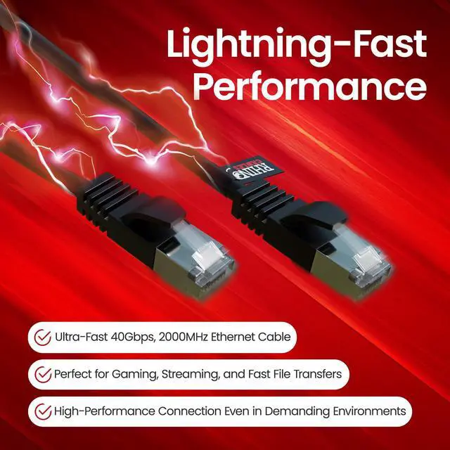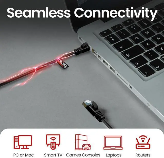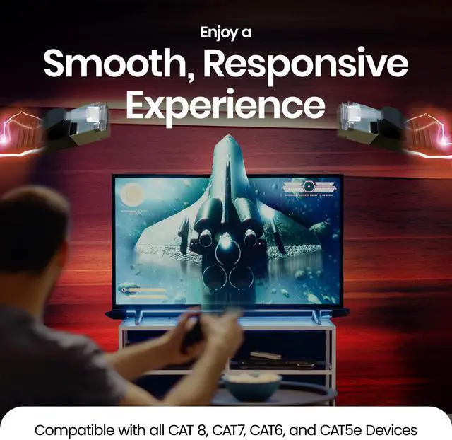 UNIVERSAL COMPATIBILITY FOR ALL DEVICES: This Cat8 ethernet cable works seamlessly with routers, modems, gaming consoles (PS5, Xbox), smart TVs, laptops and more. The RJ45 connector is compatible with Cat8, Cat7, Cat6, and Cat5e devices, making it the perfect choice for home, office, or gaming setups. Available in various sizes, from short ethernet cables to extra-long ethernet cables, to suit all needs.