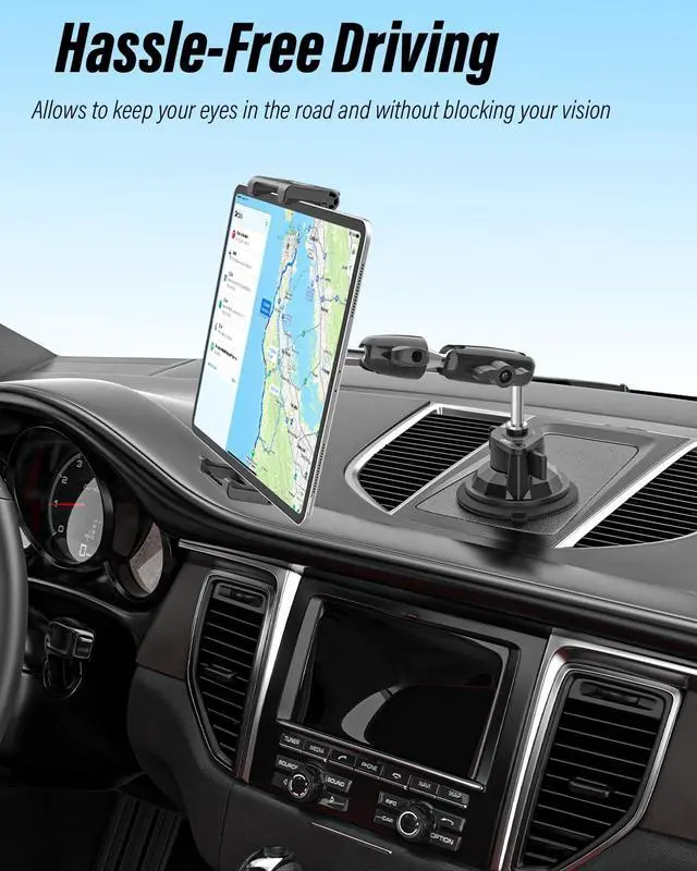 Before installation, clean the windshield or dashboard. ^^ Flexible Three-Point Mong ArmThe metal ball head of this tablet's onboard stand rotates 360 degrees, each arm can be adjusted, and each arm has a fixed button for very flexible movement and adjustment. Angle and length can be adjusted according to your needs, very convenient. While driving, enjoy a clear and unimpeded view for safety and comfort, whether you are navigating, listening to music or making a phone call. ^^ Universal 2 IN 1 Broad CompatibilityThis universal iPad stand fit for all 6""- 15.6"" inch screen smartphones and tablets, such as new 2024 iPad Pro 13-in.