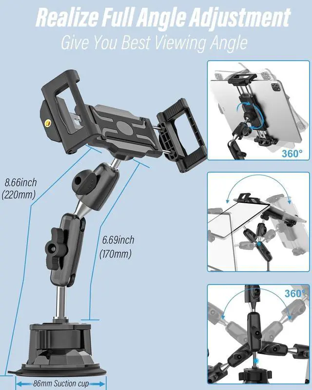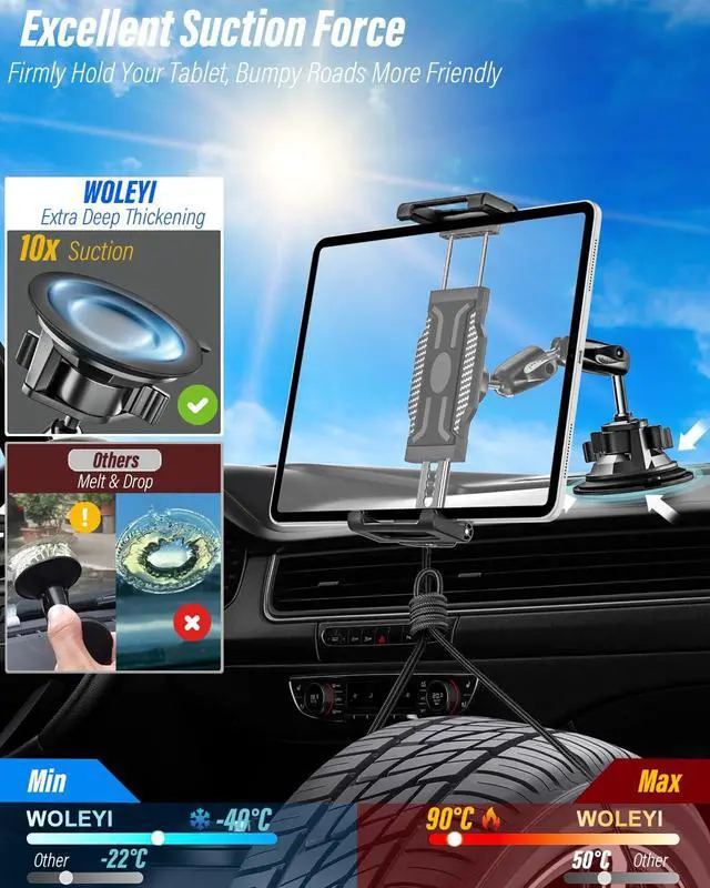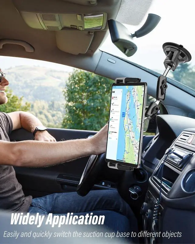 Multifunctional, MultiscenarioEquipped with a powerful suction cup and metal base, this truck tablet stand easily attaches to windshields, dashboards, consoles, desks, walls, tables, glass or other smooth surfaces for cars, trucks, semi-trailers and motorhomes. The suction cup is very strong to ensure that your tablet/phone remains stable when driving on bumpy roads without slipping. ^^ Superpower Suction CupWith strong suction cup support, the suction power is several times stronger than ordinary products. This tablet car holder is heat resistant, can be adsorbed on any surface, and is not easy to fall off while driving.