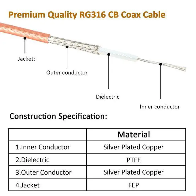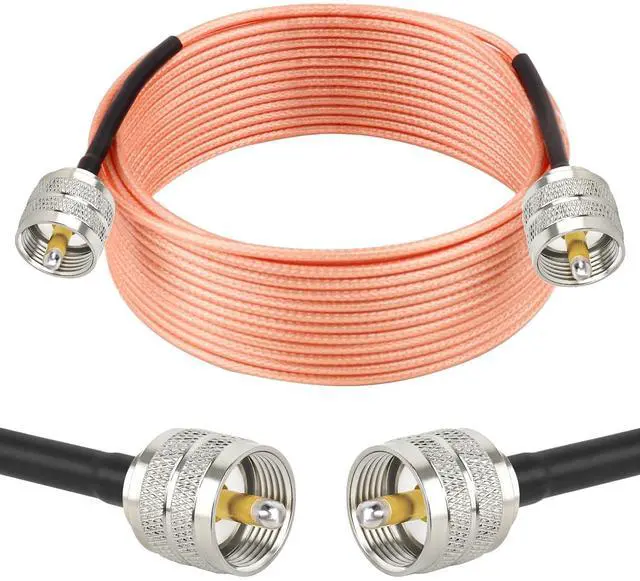UHF Male PL-259 to UHF Male PL-259 Coaxial Cable 50 ohm ^^ Cable type -- Flexible coaxial high temperature/moisture/corrosion resistance and good anti-electromagnetic interference RG316. ^^ Premium Materials -- The inner conductor of this cb coax cable is made of silver-plated copper, outer conductor made of silver-plated copper shielding braid, which could maximum protect the signal. Waterproof and flexible FEP jacket allows the pl259 cable exposure in outdoor harsh environments. ^^ Stronger Connection -- The length of heat shrink tube that connect the rg316 cable and uhf pl259 male connector is upgraded to 2.2", which can better protect the connector from falling off.
