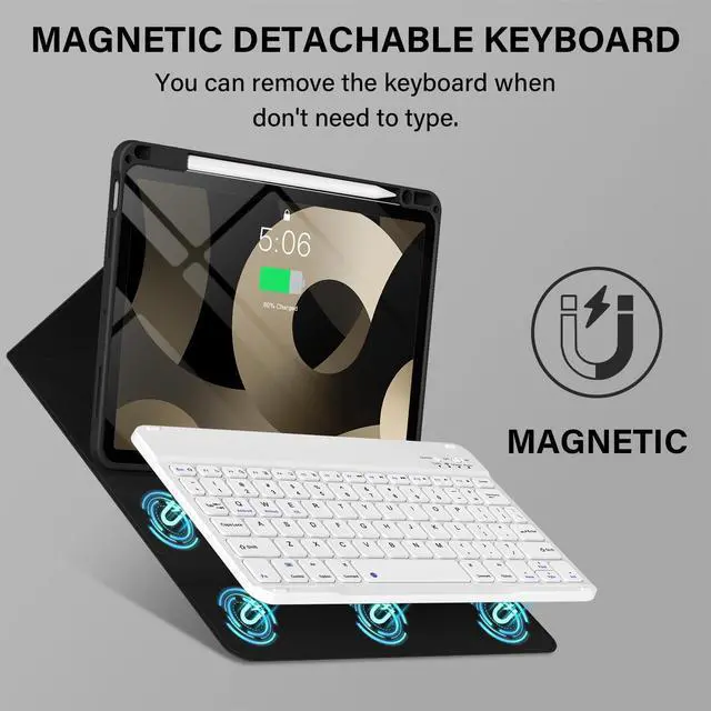 Wireless Keyboard: The magnetic bluetooth keyboard and case are separated, magnetically attached, the keyboard can be removed from the case. The keyboard can be attached to the case magnetically, if not needed, it can be removed. You can take keyboard case to anywhere anytime after 2-3 hours full charged with built-in long life rechargeable Lithium-ion battery ^^