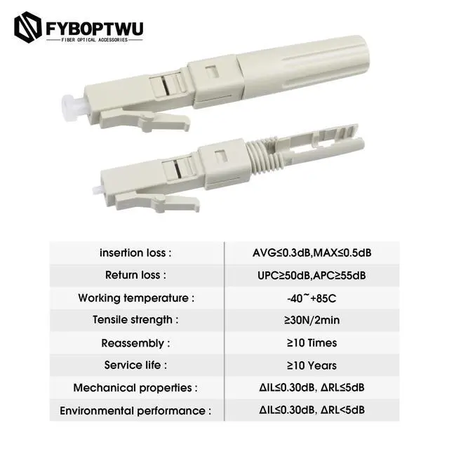 Loss: <0.3dB, Return Loss: > 50dB. High repeatability, insertion and extraction>500 times. ^^ Easy to installincluding fiber guide mechanism, more convenient to wear fiber. The package contains installation instructions. ^^ MaterialMade of high performance materials, more durabler, resistant to high temperature and falling. ^^ ApplicationSuitable for 0.9 mm/ 2.0 mm/ 3.0 mm round fiber cable and 3.0 * 2.0 mm drop cable.