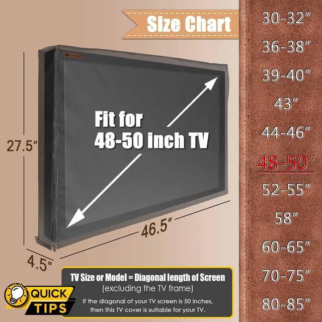 NOTE: If your TV has a soundbar, wide border, or thicker than usual, please measure the length and width of your TV's outer frame and compare it to the size of TV cover ( 46.5"W x 27.5"H x 4.5"D ) to ensure a proper fit. ^^ PREMIUM 600D