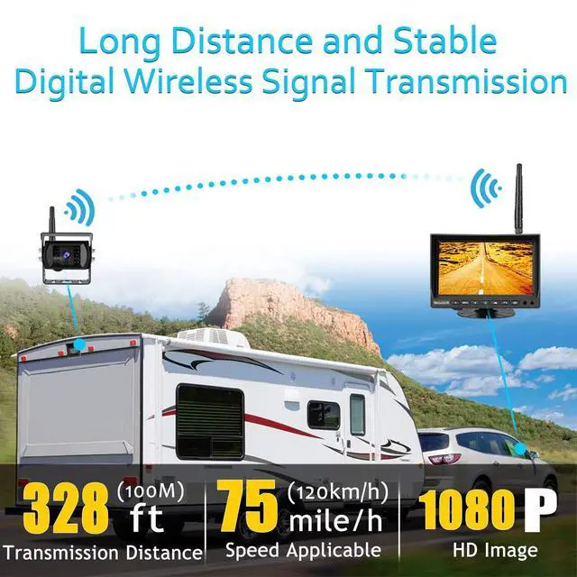 &: Engineered with advanced 2.4GH z wireless technology, this system delivers a stable, interference-resistant connection. It offers a transmission range of up to 650ft in open areas and maintains smooth video for vehicles up to 66ft long, even at highway speeds. An included camera antenna extension cable ensures consistent reception, making it ideal for RVs, pickups, buses, trailers, and semi-trucks. ^^.: Featuring a 7-inch 1080P monitor and a high-performance 1080P CMOS camera, the system provides sharp, realistic images. Both the monitor and camera are equipped with built-in sunshades to minimize glare from strong sunlight. The 140 wide viewing angle effectively captures more of the rear view to eliminate blind spots for safer driving. ^^.