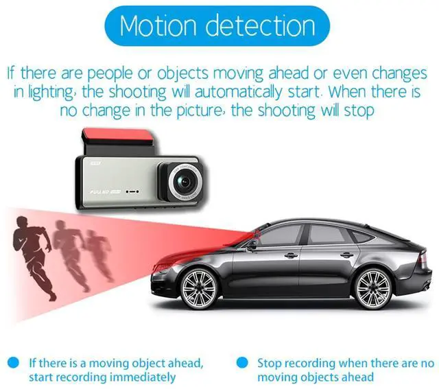 Motion Detection: Our car camera automatically overwrites old footage when storage is full, while motion detection activates recording during movement, ensuring no critical moments are missed.