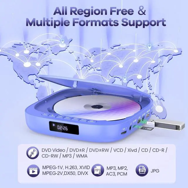 263, XVID, DX50, DIVX, MP3, MP2, WMA, AC3, PCM, JPG (AVI/MPG/MPEG4/VOB) and the video files of 720*480/576. The USB and TF card format need to be FAT32, storage up to 32GB. ^^ All Region Free DVD PlayerThe small dvd player support to play DVDs from different regions.