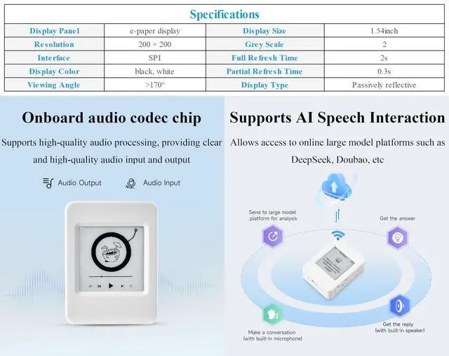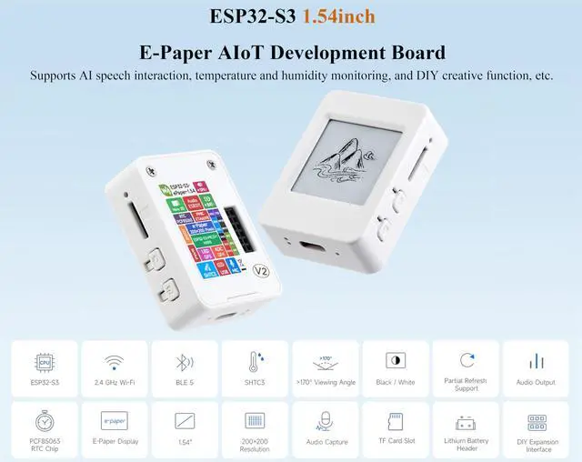 The ESP32-S3-ePaper- 1.54 is an e-Paper AIoT development board, equipped with ESP32-S3 microcontroller, adopts high-performance Xtensa 32-bit LX7 dual-core processor, up to 240MHz main frequency. Suitable for Voice Interaction and e-Reader, etc ^^ Supports 2.4GH z Wi-Fi ( 802.11 b/g/n) and Bluetooth 5 (LE), with onboard antenna. Built-in 512KB Static RAM, 384KB ROM, with integrated 8MB Flash and 8MB PS-RAM. ^^ Onboard 1.54 inch e-paper display, 200 200 resolution, features high contrast and wide viewing angle. Onboard audio codec chip, supports voice capture and playback, enabling AI voice interaction applications.