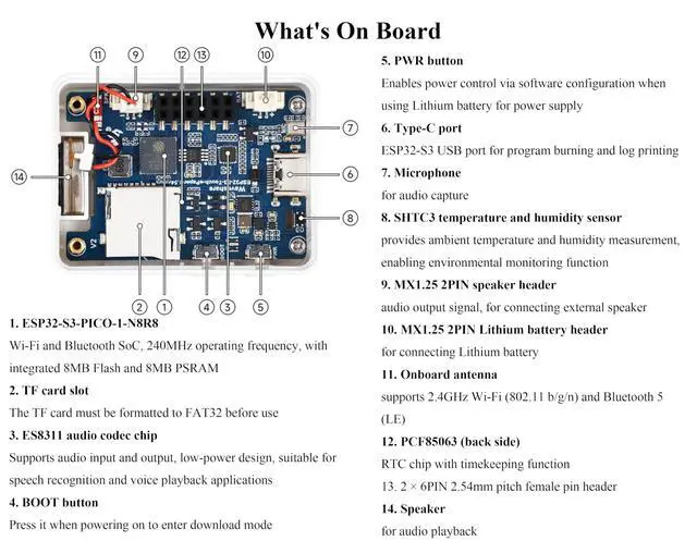 Supports AI Speech Interaction: Allows access to online large model platforms such as DeepSeek, Doubao, etc. ^^ Onboard PCF85063 RTC chip and SHTC3 temperature & humidity sensor for accurate RTC management and environmental monitoring. Onboard TF card slot for external storage of images or files. Onboard programmable PWR and BOOT side buttons for customized function development. Reserved 2 6 2.54 mm pitch pin header for convenient external expansion. ^^ Supports ESP-IDF, Ardui