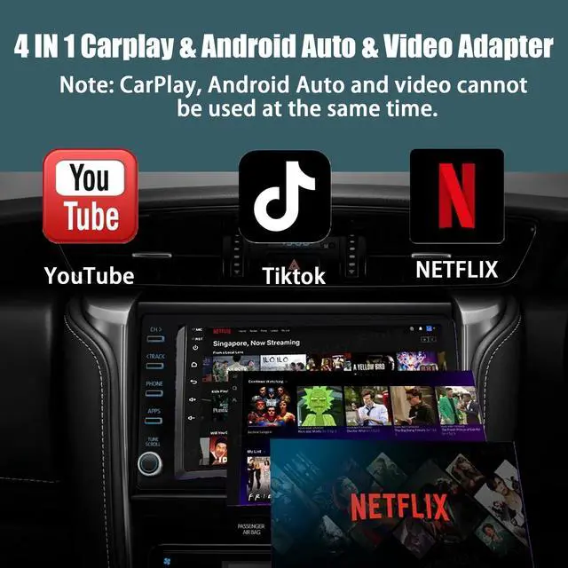 This ensures a straightforward and efficient user experience. ^^ [Dual Power Supply System for Enhanced Stability] The adapter features a Type-C + USB-A dual-interface power cable that intelligently regulates current and voltage. This resolves issues of lagging and disconnection caused by insufficient power supply in certain models, significantly improving connection stability. ^^ [4-in-1 Multifunctional Entertainment System] The wireless CarPlay adapter integrates built-in applications such as Netflix, YouTube, and TikTok, enabling playback of diverse video content. It supports wireless CarPlay/Android Auto, TF card local media playback, smartphone Bluetooth audio streaming, and seamless switching between the original car system, fulfilling all in-car entertainment requirements.