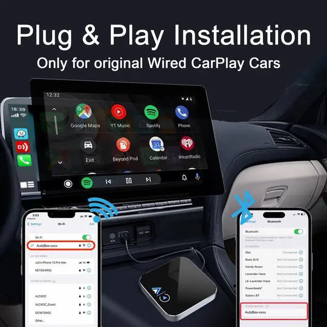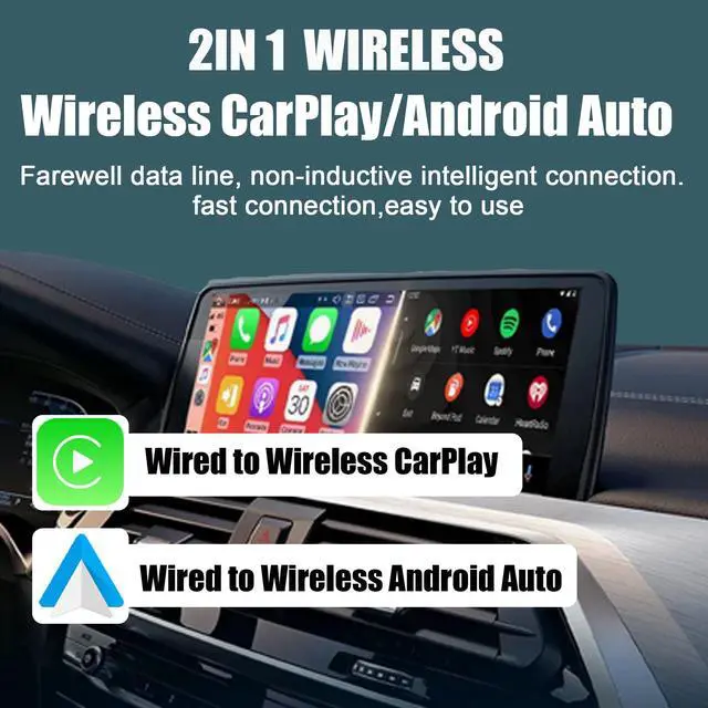 [Wireless CarPlay & Android Auto Dual Mode Support] The wireless CarPlay adapter is fully compatible with iPhones (iOS 10+ / iPhone 5s or later) and Android devices (Android 11+). It enables seamless upgrading of the original wired CarPlay/Android Auto connection to a wireless mode, eliminating the need for data cables. This enhances driving freedom and safety. (Not compatible with BMW and Tesla vehicles. ) ^^ [Intelligent Quick Connection via Plug-and-Play] Equipped with the latest Bluetooth and WiFi technologies, the wireless CarPlay adapter connects effortlessly by inserting it into the vehicle's USB port. The phone pairs with "AutoBox-XXXX", requiring no complex configurations.
