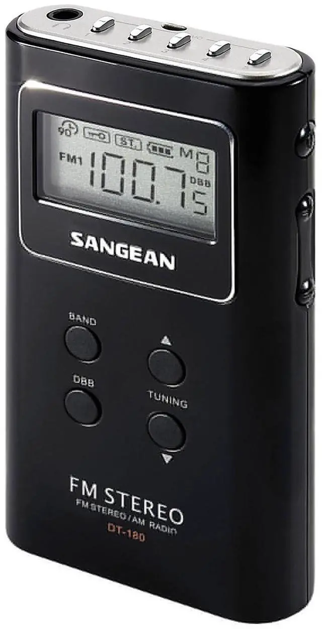 Underneath the beautiful black case, the DT-180 AM/FM Compact Pocket Radio is a radio compact in size but offering amazing sensitivity and selectivity with Digital Tuning that will easily tune in and program all of your favorite stations. The DT-180 features 15 preset stations (10 FM, 5 AM), auto search, battery indicator and turns off automatically after 90 minutes to conserve battery life.