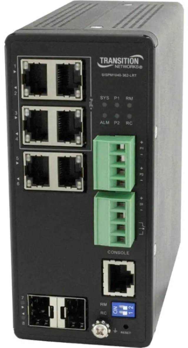 • Lantronix SISPM1040-362-LRT Managed Hardened Gigabit Ethernet PoE+ Switch, 4-10/100/1000Base-T PoE+ Ports, 2-10/100/1000Base-T RJ-45 and 2-100/1000Base-X SFP Slots, Transition Networks, Inc, Lantronix