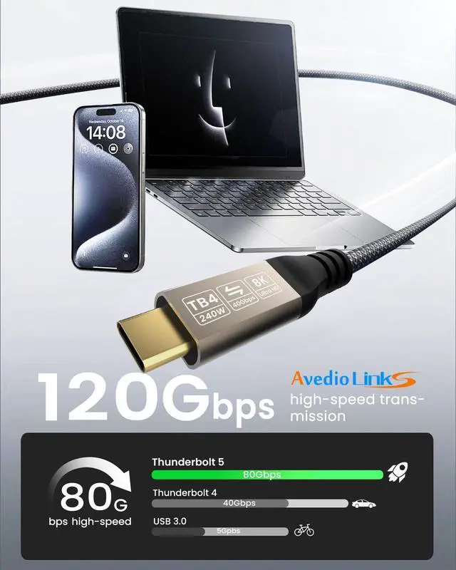 • 16K Display & Multi-Screen Support: Experience next-level visuals with support for 16K@60Hz, dual 8K@120Hz, or triple 4K@144Hz displays (requires compatible devices). The avedio links Thunderbolt 5 cable supports refresh rates up to 4K@480Hz, delivering buttery-smooth motion, accurate