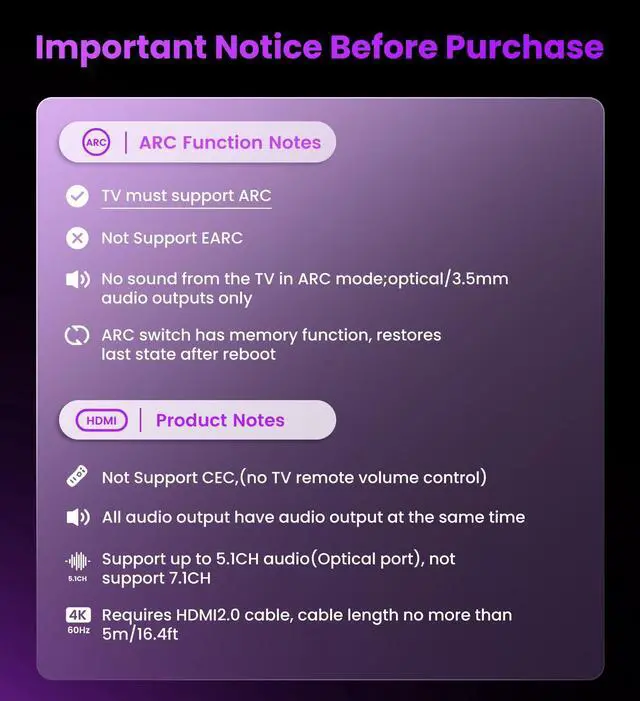 Return Channel) Function: ARC lets your TV send audio to an external sound system (such as a soundbar or receiver), allowing you to enjoy an immersive home theater experience instead of the poor sound of TV.