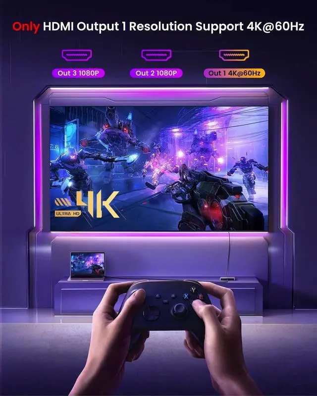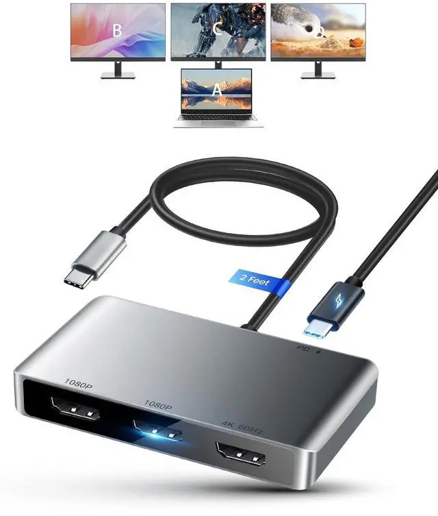 UHD Resolution: HDMI adapter to 3 monitors with 1x HDMI 4K@60Hz port + 2 x HDMI 1080P@60Hz port, 3 port can work synchronously; Suggest use HDMI 1.4 cable length not exceed 9.8 ft for 1080P, HDMI 2.0 cable not exceed 16.4 ft for 1080P, HDMI 2.0 cable not exceed 9.8 ft for 4K ^^ 100W