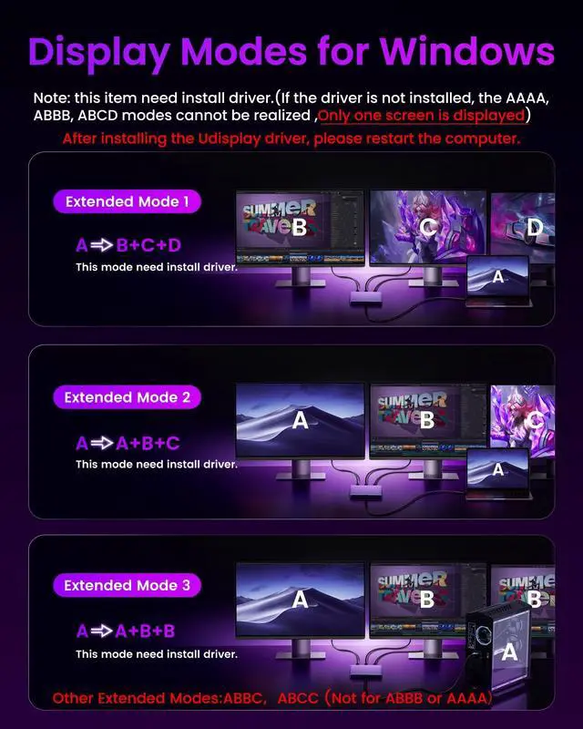 ^^ Note: The driver needs to be installed successfully. (If the driver installation is unsuccessful, the AAAAABBB, ABCD modes cannot be realized., only 1 screen is displayed). If the driver is installed for the first time, the PC/Laptop needs to be restarted after success ^^ Display