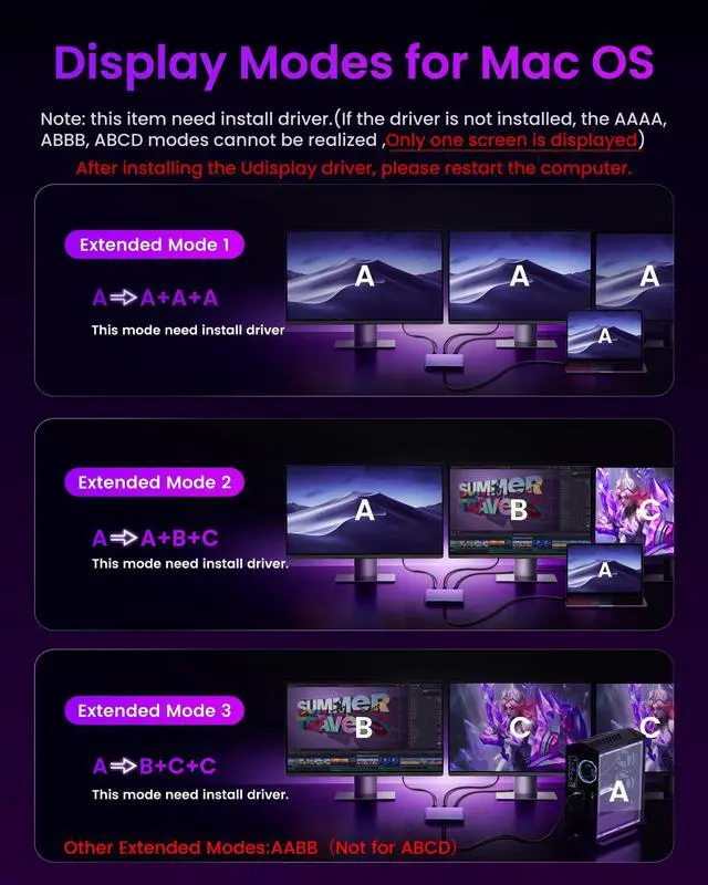 Driver Needed: USB 3.0 to HDMI adapter need install driver. Before order it, please make sure your laptop/PC has full function thunderbolt port, or with USB 3.0 port or above version and support DP Alt mode(Or a USB C port supporting DP version 1.2 or above). It require window 10 or Mac OS 12 or higher system versionMac OS 26.1 and above users, please contact us through the manual channel to obtain the latest version of the extension.