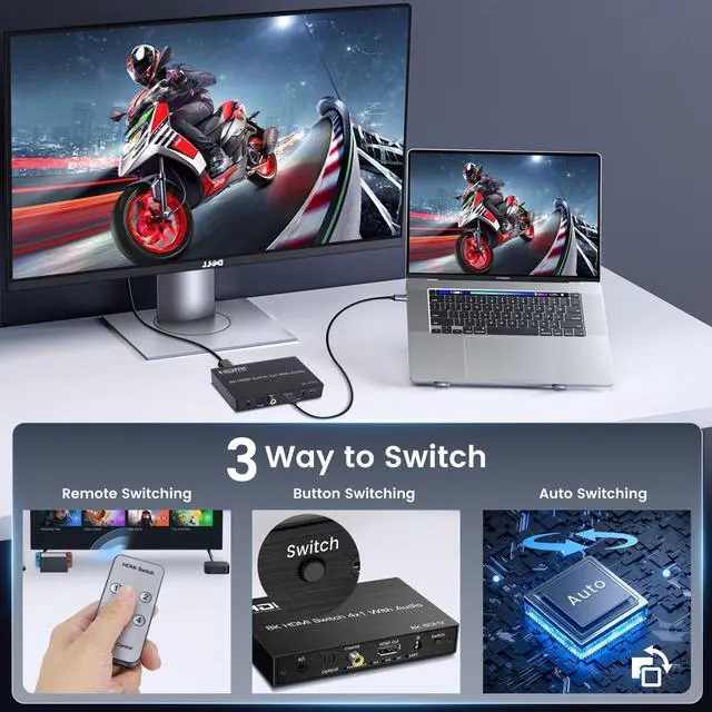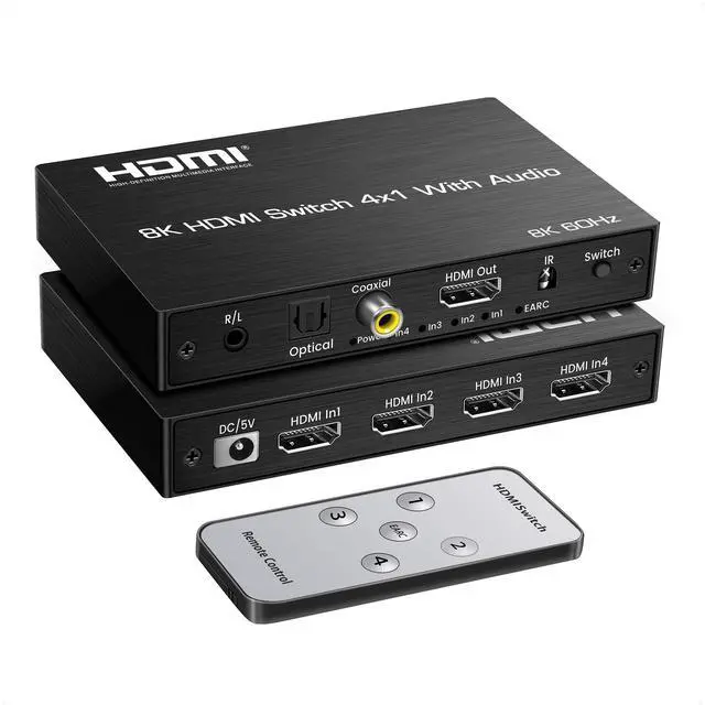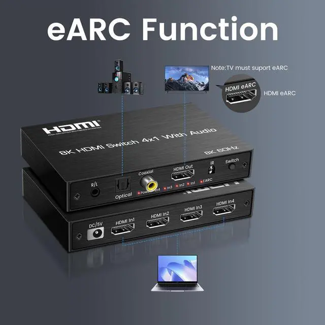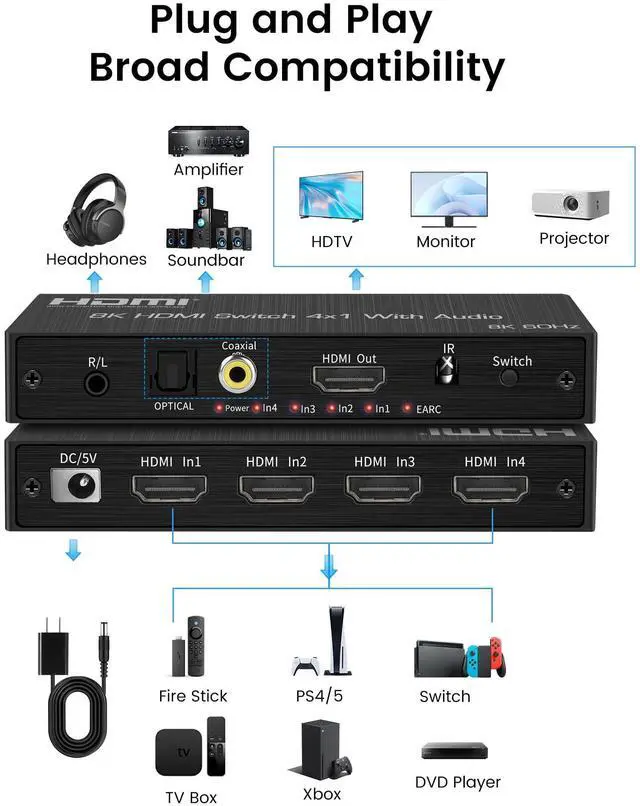 Switch: The hdmi switch connects up to four hdmi sources to a single display, making it easy to switch between sources. It supports up to 8K@60Hz and 4K@120Hz, plug and play. It also extracts audio from HDMI sources and supports outputting audio via eARC/ARC to soundbar, optical Toslink SPDIF 5.1C h audio devices or coaxial, L/R 2.1C h audio devices. ^^