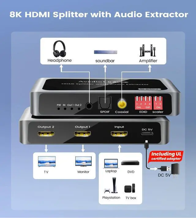 Crisp UHD & Ultra-Wide Visuals: Supports 8K@60Hz, 4K@120Hz, 2K@75-144Hz, 1080P@60-480Hz, HDR 10+, and ultra-wide formats like 76801200@60Hz (48Gbps). Independent scaler switches let 8K and 4K screens work togetherperfect for mixing-resolution setups ^^ Flexible Audio Output & Smart EDID: Output audio via coaxial, 3.5 mm, or SPDIF.