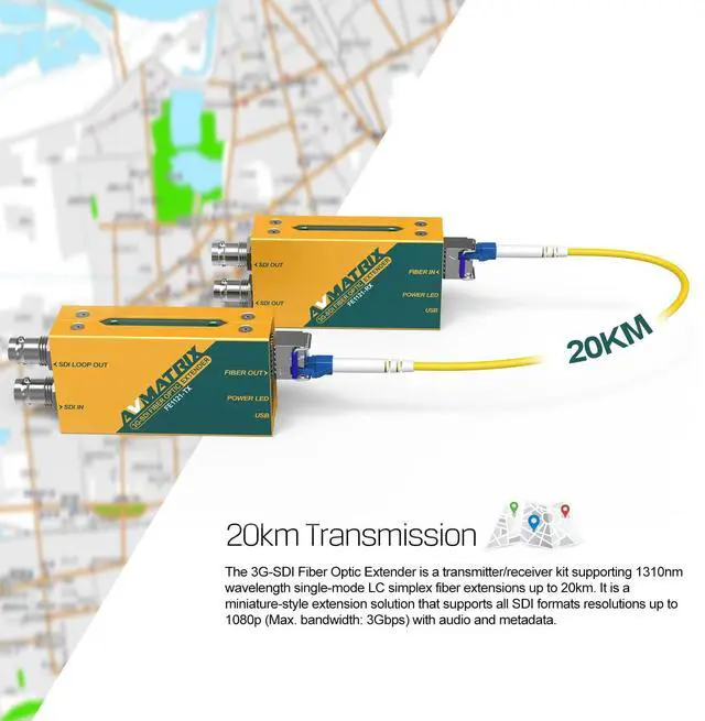 The AVMATRIX FE1121 3G-SDI Fiber Optic Extender is a transmitter/receiver kit supporting single-mode LC simplex fiber extensions up to 20km. It is a miniature-style extension solution that supports all SDI formats resolution up to 1080p with audio and metadata, also supports level A and level B. It features a local SDI loop out and dual SDI outputs and supports 3G/HD/SD SDI signals.