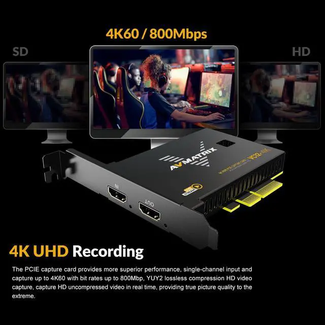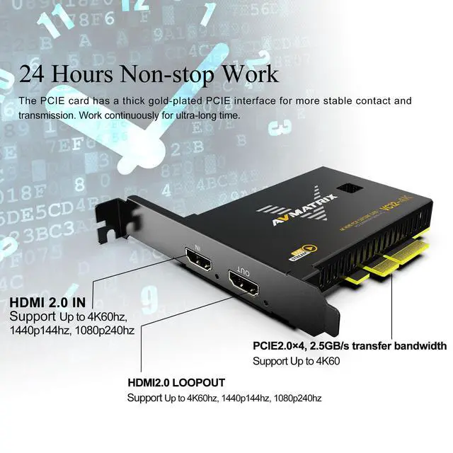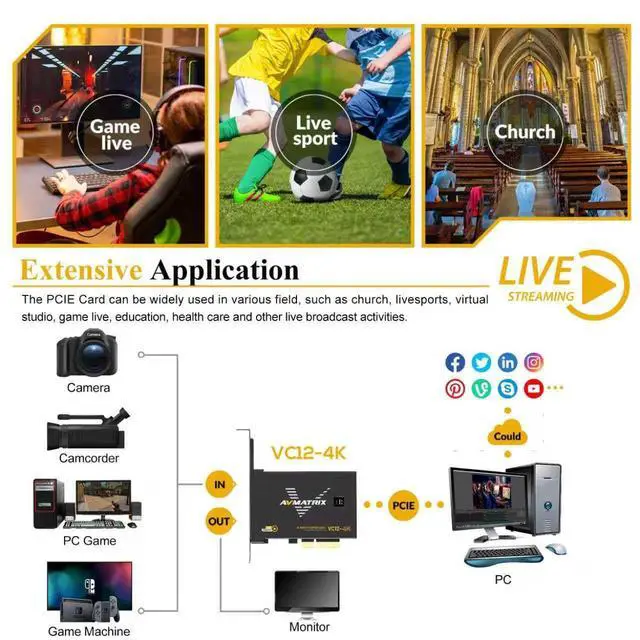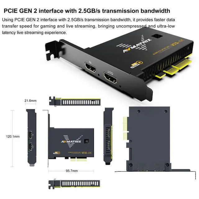 widely used in live sports streaming, medical imaging, university lectures, and multi-camera church setups. ^^ High-bandwidth and Ultra-low Latency Using PCIE GEN2 interface with 2.5GB /s trandmission bandwidth, it provides faster data transfer speed for gaming and live streaming, bringing uncompressed and ultra-low latency live streaming experience. ^^ Complete compatibilitysupport streaming or recording application such as OBS, Teams, Twitch, etc. and users can use the PCIE capture card to broadcast the captured video to major live streaming platforms, such as YouTube, Facebook, Bilibili, etc.