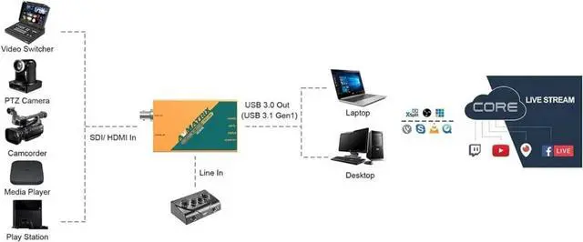 Gross Weight: 300g Key Features Plug-and-Play, driver free & power free HDMI or SDI in, and USB 3.1 Gen1(USB 3.0 ) out Automatic input signal detection, up to 1080p60 Uncompressed transmission rate up to 200MB/s via USB 3.1 Gen1 Comply with UVC video capture and YUY2 video output Comply with UAC audio out from SDI/HDMI embedded audio or line in Compatible with Windows, Linux, macOS Compatible with OBS, ZOOM, Teams & Twitch, etc.