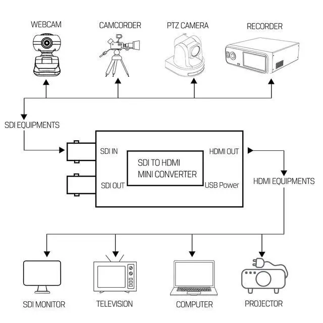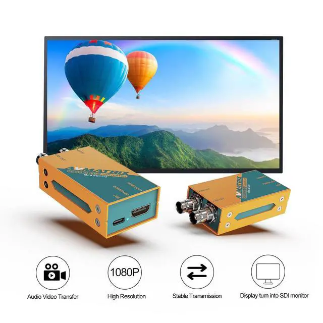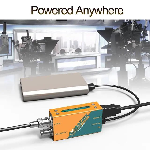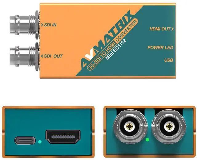 SDI and HDMI interfaces, multiformat Supported1 x HD/SD/3G-SDI In, 1 x SDI HD/SD/3G-SDI Loop Out, 1 x HDMI Out. Multiformat Supported 480i 60/576i 50/ 720p 50/ 59.94 /601035i 59.94 /601080i 50/ 59.94 /60/1080p 23.976 / 23.98 /24/25/ 29.97 /30/50/ 59.94 /60 ^^ 7 x 24 h uninterrupter workingSteady and Reliable Performance, Support 7 x 24 h uninterrupter working without any lag or delay. ^^ USB-C Power & low power consumptionFeatured with universal USB power solution design, avmatrix miniconverter can be powered by Micro uSB connection; it can not only connect with DC power plug pack, but also get power from powerbank, laptop or computer.