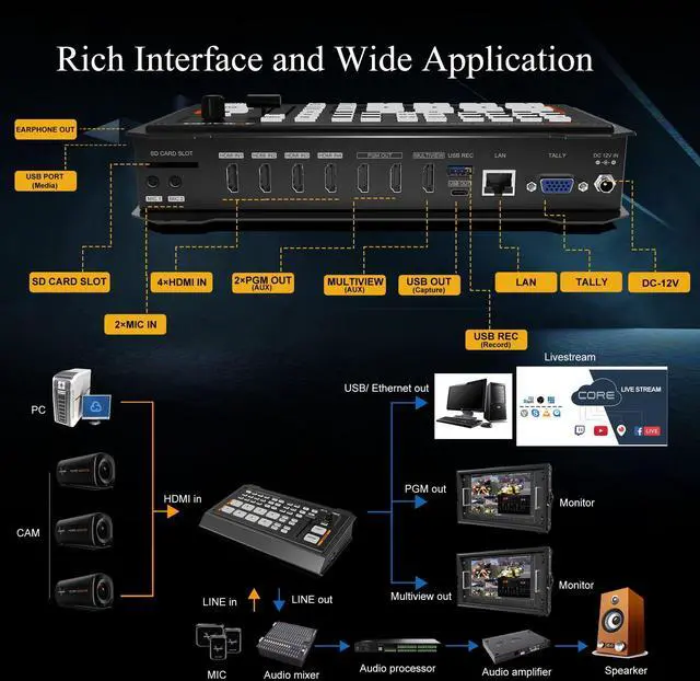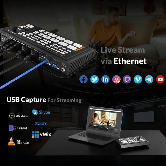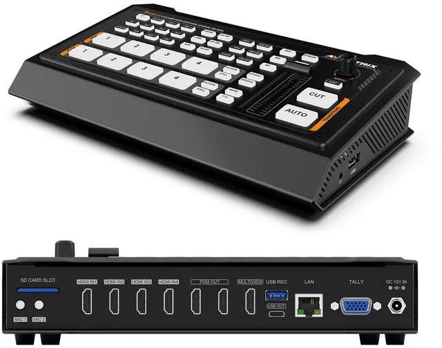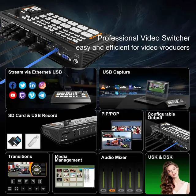 lt is compatible with Windows, Linux, and Mac. ^^ USB Disk & SD Card Recordsupport 2 method to recode, SD card and USB-A interface enable direct recording of PGM signal, making it easy to record high-quality videos. Bitrate of encode up to 32Mbps, and the supported file formats are MP4/TS. ^^ Up to 6 layers of effects Chroma Key, luma Key, Logo, DSK Support add post-production in real time, Up to six layers of effects can be stacked. WIPE, DIP, MIX transition effects can help to make live streaming more interesting and fantastic.