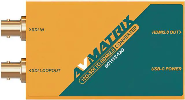 AVMATRIX SC1112-12G 12G-SDI TO HDMI 2.0 4K Broadcast Converter; 12G-SDI Loop-out; Up to 4K60 Resolution; USB Type-C Power; SDl with Equalization and Re-clock; Video and Power Signal LEDsSC1112-12G is a portable 12G-SDI to HDMI 2.0 converter. With USB Tpye-C power supply, SC1112-12G is the best choice for outdoors and indoors. With 12G-SDI input and 12G-SDI loop-out, SC1112-12G can auto-detect HD/3G/6G/12G-SDI signal up to 4K@60, and support both Level A and Level B. HDMI output is compatible for more consumer electronics such as HDMI Television, projector, VCR, etcKey