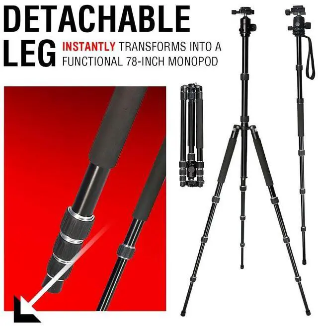 ^^ Optimal Versatility: Designed for the professional photographer on the move, this Travel Tripod instantly transforms into a functional 78-inch monopod with its detachable leg. It also boasts a removable ball head and a reversible center column.