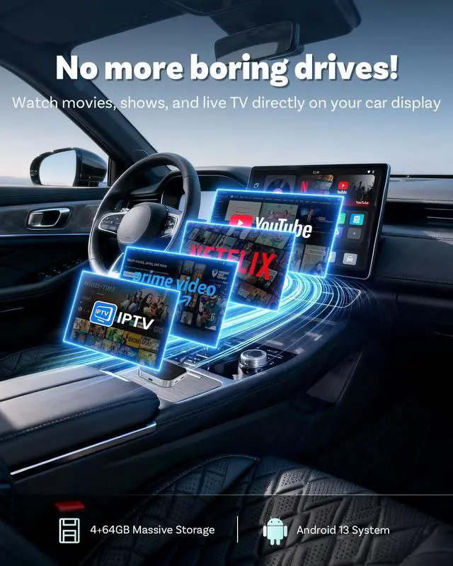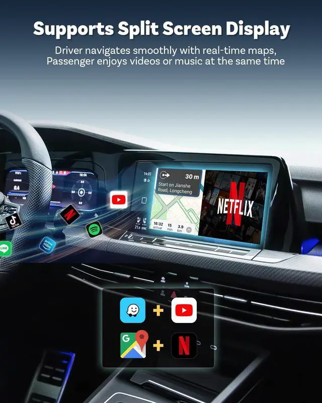 Blazing-Fast Performance Powered by the Android 13 system, this Ottocast smart AI box transforms your car screen into a smartphone-like device. No more lag, black screens, or random restartsjust instant response and stable performance, even on long drives. ^^ Immersive In-Car Entertainment Turn your car into a personal cinema and sports hub. Watch Netflix originals, binge shows, stream Hulu dramas, or catch live sports like the NFL, NBA, and even the Super Bowlall with audio seamlessly integrated into your car OEM sound system. ^^ Split-Screen Multitasking, One Screen Double Fun More than just a car video player, this car streaming box supports true split-screen multitasking.