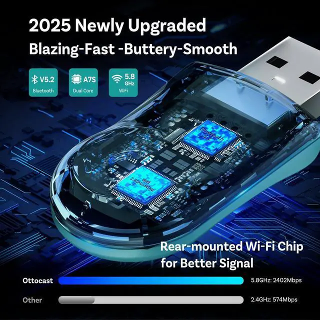 Ottocast Mini Wireless CarPlay Android Auto AdapterUpgrade your car with the Ottocast 2in1 wireless CarPlay adapter. It cranks out CD-quality audio through 5GHz WiFi for iPhone iOS 10+ and Android 11+, delivering sound 10x sharper than basic Bluetooth. Sleek design with REAL WIRELESS TECHkick those cables to the curb and embrace pure wireless vibes! Perfect match with 98% of cars that supports Wired CarPlay/Wired Android Auto(Not for BMW/Tesla). ^^ Blazing-Fast ConnectivityThis CarPlay Android Auto wireless adapter is loaded with 5GHz WiFi, Bluetooth 5.0, and a next-gen chip for lightning-fast 10s setup and a buttery-smooth 5-second Auto-Reconnect.