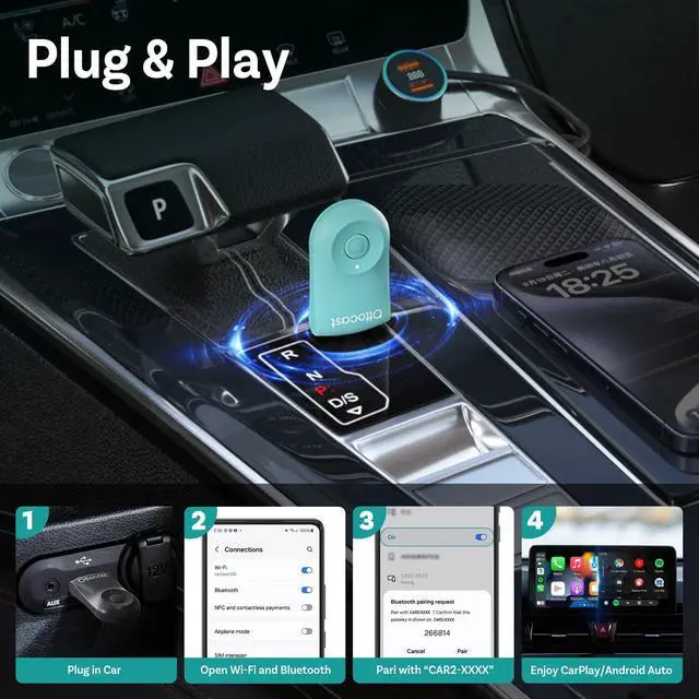 Get 3x faster speeds, silky performance, and glide through navigation, music, calls, and messages via Siri, touchscreen, or buttons. Rock-Solid connectionwhether you're road-tripping coast to coast or hitting low-bars areas, the OTTOCAST MINI keeps the good times rolling. ^^ Plug and Play, Auto-ReconnectKeys in? Car connects! Setup's smoother than a fresh jar of