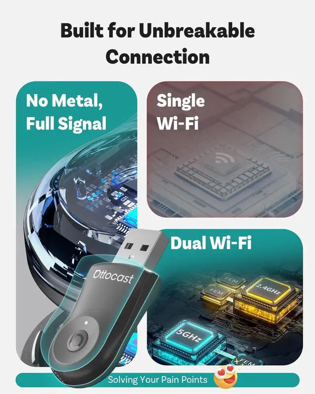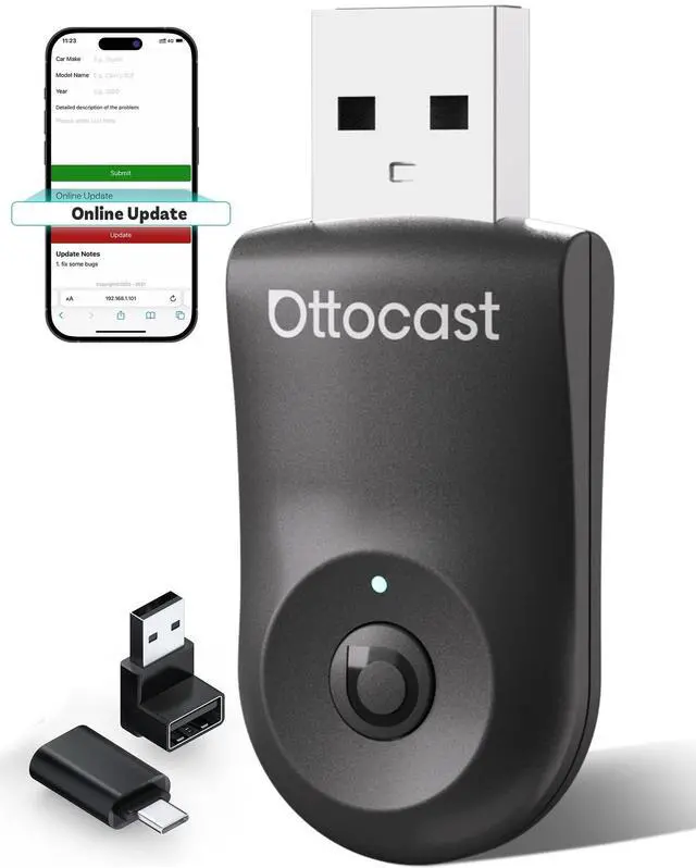WIFI: Stay reliably connected for flawless audio and navigation. Utilizing advanced 5GHz Wi-Fi, the Ottocast Mini ensures a strong, stable data stream with minimal interference, crucial for consistent performance. Picture yourself on a long road trip, enjoying uninterrupted podcasts or relying on precise, real-time navigation without dropouts. Experience crystal-clear hands-free calls all thanks to a connection engineered for reliability, rivalling wired performance. ^^ SIMPLE ONE-TIME SYNC READY IN MOMENTS: Upgrading to wireless is incredibly straightforward. The Ottocast Mini requires just a simple, one-time synchronization process. Plug it into your car's CarPlay/Android Auto USB port, pair it via Bluetooth on your phone using the intuitive on-screen guide (takes only about a minute! ), and you're permanently set for automatic wireless connections on future drives. No complex configurations, no special knowledge needed just plug, sync once, and enjoy! ^^ BROAD VEHICLE & PHONE SUPPORT WORKS LIKE FACTORY: Designed for wide compatibility with vehicles already equipped with factory wired CarPlay or wired Android Auto (most 2016+). It works seamlessly with iPhones (iOS 10+) and compatible Android phones (Android 11+, 5GHz Wi-Fi needed for AA). Crucially, it integrates perfectly, allowing you to retain full use of your factory touchscreen, steering wheel buttons, and voice assistant commands. Enjoy the wireless upgrade without losing the familiar, native control of your system. ^^ ENGINEERED FOR LONGEVITY WITH OTTOCAST EXPERTISE: Invest in a durable solution from Ottocast, leaders in smart car connectivity. The Mini is built for reliable daily use and benefits from continuous improvement via easy online firmware updates ensuring compatibility with future OS versions and optimizing performance. This future-proof approach, backed by Ottocast's focused expertise and customer support, means you get a consistently smooth wireless experience that lasts.