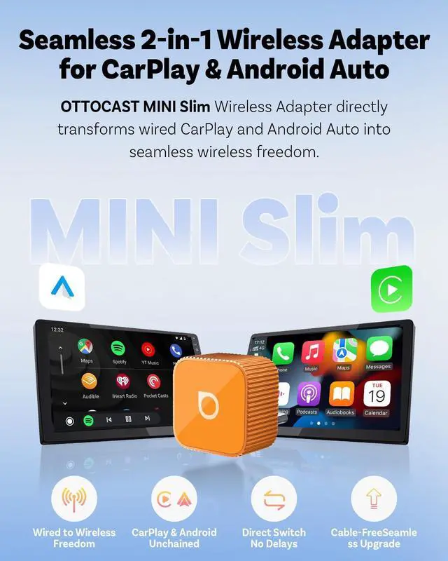 One Tiny Hub, Two Wireless WorldsWhy choose? The Ottocast mini slim is a true 2-in-1 wireless CarPlay and Android Auto adapter. Whether youre an iPhone devotee or an Android power user, this tiny bridge connects your smartphone to your cars screen wirelessly. Its the perfect solution for families with "mixed" deviceseveryone gets their favorite interface without switching cables! ^^ Built for