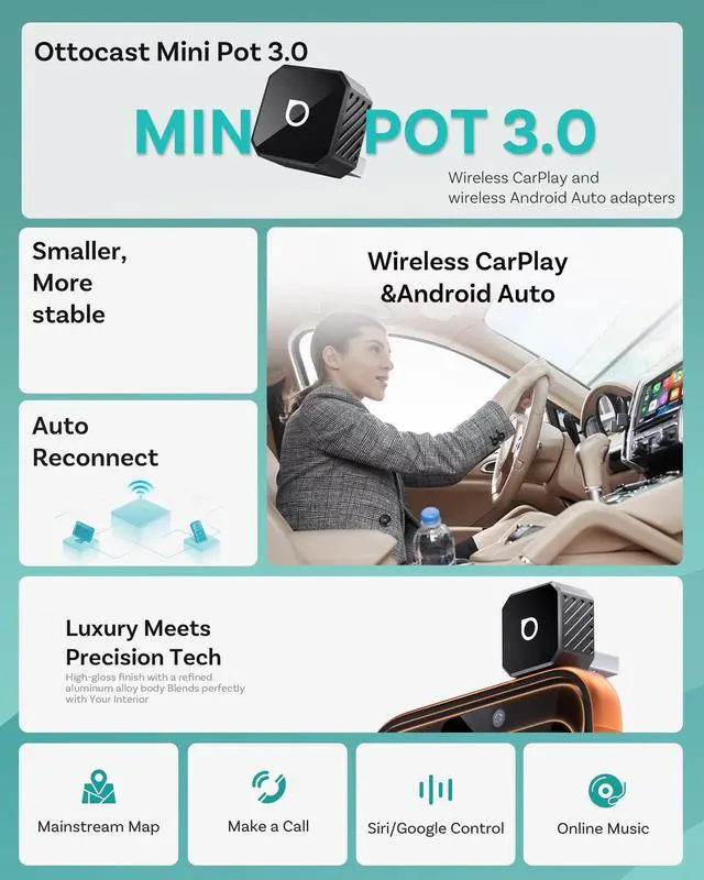 ^^ Drive-Friendly Controls Full compatibility with steering wheel buttons, dash knob, touchscreen and voice assistants for safer driving. ^^ Superior Audio Over Bluetooth Hi-Fi sound and reduced lag compared with standard Bluetooth car adapters great for music lovers and conference calls. ^^ After-Sales Service 30-day returns 24-month warranty US-based support. OTA Upgrades