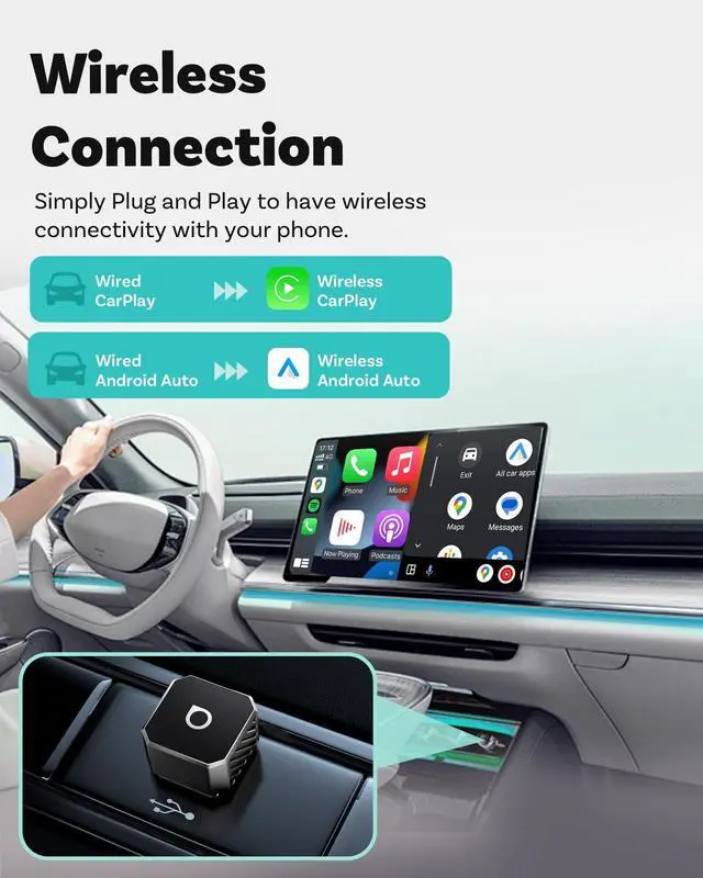 Universal Car Compatibility Wireless CarPlay adapter & wireless Android Auto adapter in one ideal for cars with factory wired CarPlay/Android Auto, covering sedans, SUVs, trucks etc. If your car has wired CarPlay/Android Auto, this adapter is made for it. ^^ Auto Switch for Two Phone Automatically reconnects to the last used phone or the second saved device ideal for shared cars, couples, and family use. ^^ High-Speed Dual-Band WiFi 5GHz support for low latency and stable navigation, music streaming and call quality during long trips. ^^ Universal Fit for USB-A & USB-C Cars Built with a USB-A plug and an included A-to-C adapter, this wireless CarPlay/Android Auto dongle works smoothly with both USB-A and USB-C car systemsno extra accessories required.