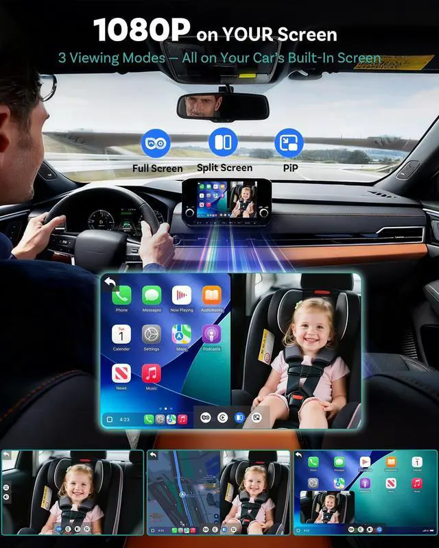 Screen or Picture-in-Picture: The adapter supports split screen or picture-in-picture so navigation, calls, and music can stay active while the camera view remains visible. Parents who monitor children, or pet owners during long drives, get peace of mind without losing CarPlay convenience. ^^ Solid Mounting, No